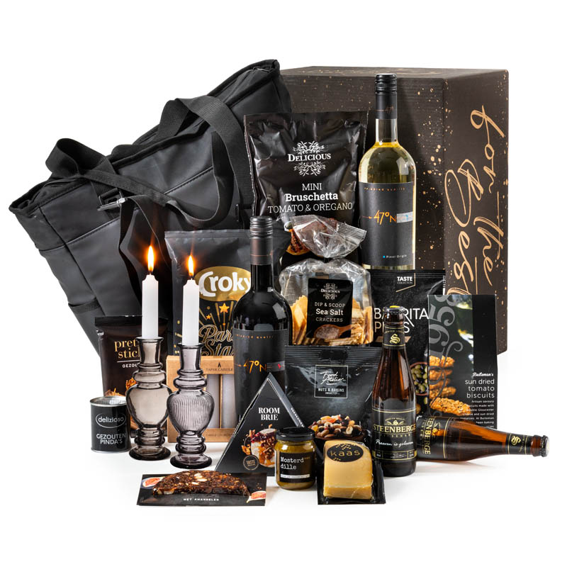Dit fraaie kerstpakket bevat een elegant en compleet borrelpakket inclusief een luxe koelshopper van suédelook PU. Met twee flessen Moldavische wijn, heerlijke kazen en een ruim assortiment hartige delicatessen is dit het perfecte cadeau voor fijnproevers, wijnliefhebbers en levensgenieters. Compleet met kandelaars en kaarsen; een prachtig pakket om te ontvangen.