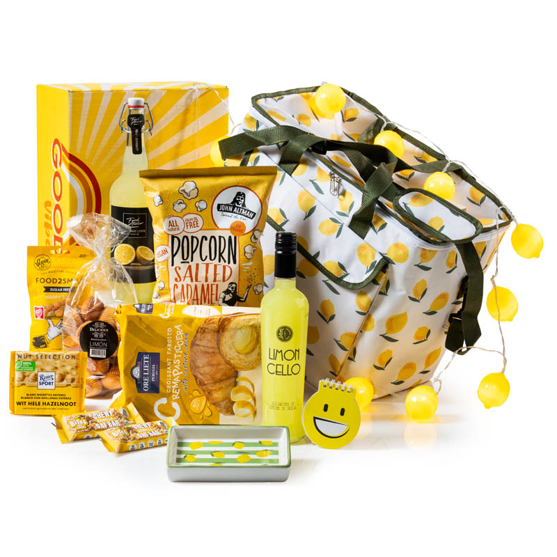 Breng de zonneschijn in huis met dit verfrissende geel getinte kerstpakket! Een gedurfd kerstpakket voor iemand die nu al zin heeft in de zomer! Met limoncello, citruslimonade (zonder alcohol), frisse snacks, vrolijke gadgets en een stijlvolle koel-/picknicktas is dit het ideale feelgood cadeau. Op naar het warme weer!