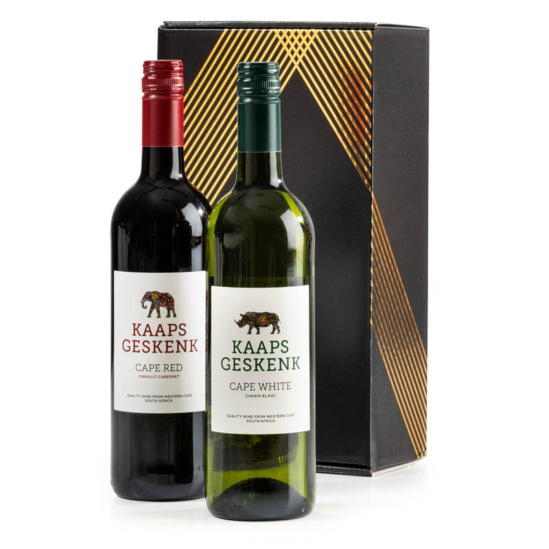 INHOUD: -Zuid-Afrikaanse witte wijn Kaaps Geskenk Cape White, 75 cl -Zuid-Afrikaanse rode wijn Kaaps Geskenk Cape Red, 75 cl -Verpakt in een wijn geschenkdoos
