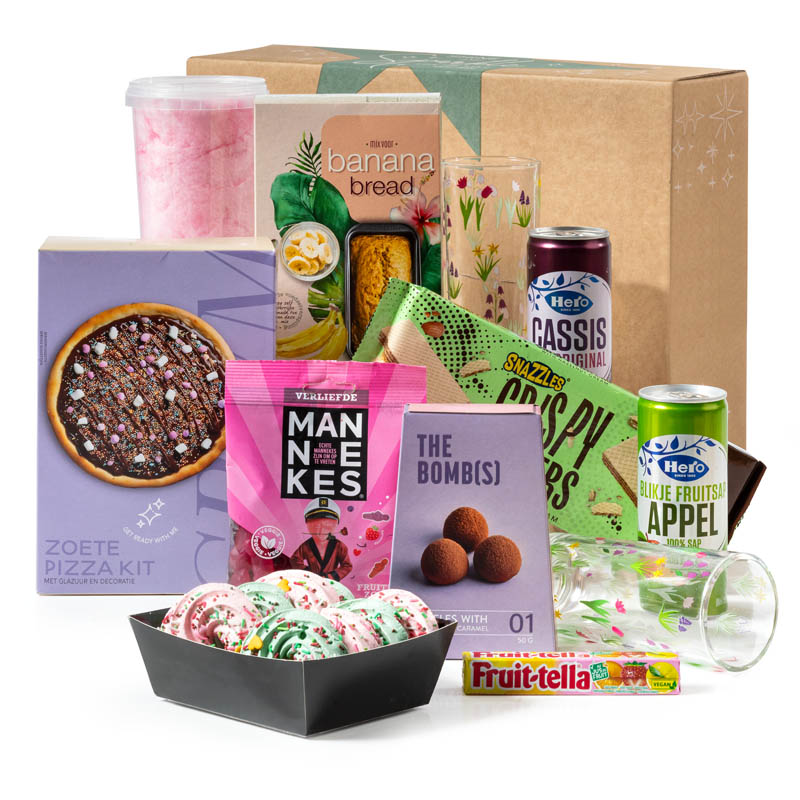 INHOUD: -Twee limonadeglazen met bloemprint, -310 ml -Hero appelsap, 25 cl -Hero cassis, 25 cl -Sweet pizzamix, 305 gram -Snazzles hazelnootcr?me wafels, 170 gram -Mix voor banana bread, 450 gram -Meringue kleurige kerstkransjes, 85 gram -Cacao truffels, 50 gram -Suikerspin, 0,5 liter -Verliefde Mannekes fruit gums, 100 gram -Fruit-tella summer fruits (vegan), 41 gram -Verpakt in een bijpassende geschenkdoos