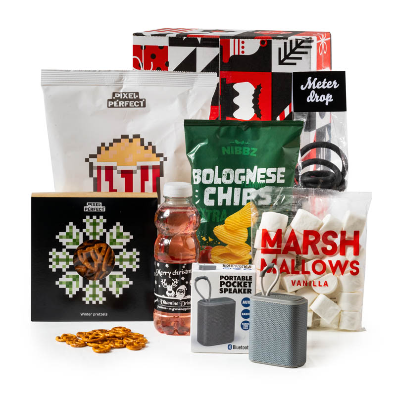 Dit is zeker geen standaard kerstpakket -dit is next level! Het Pixel Party Pakket is speciaal samengesteld voor de echte snackliefhebber die houdt van chill vibes, gamen of gewoon lekker loungen met toffe muziek en iets lekkers binnen handbereik. Een pakket voor de jeugd zou je denken, maar wellicht verras je er ook de iets oudere mens mee! Of je nu een avondje Netflixt, een potje gamet of je muziek aanzet en ontspant -dit vrolijk getinte kerstpakket zorgt voor sfeer, smaak en fun.