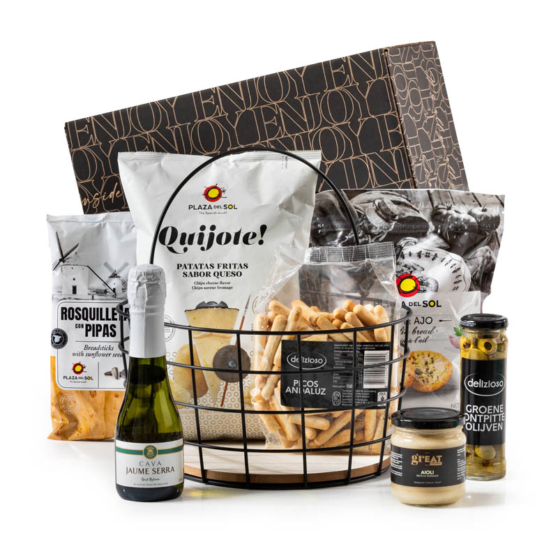 Vier de feestdagen op zén Spaans! Een klein maar fijn luxe borrelpakket vol mediterrane smaken: knoflookbrood, olijven, aioli, en een lekkere bubbel, geleverd in een fraaie veelzijdig te gebruiken, metalen mand. Ideaal voor de echte tapasliefhebbers of een feestelijk avondje thuis.