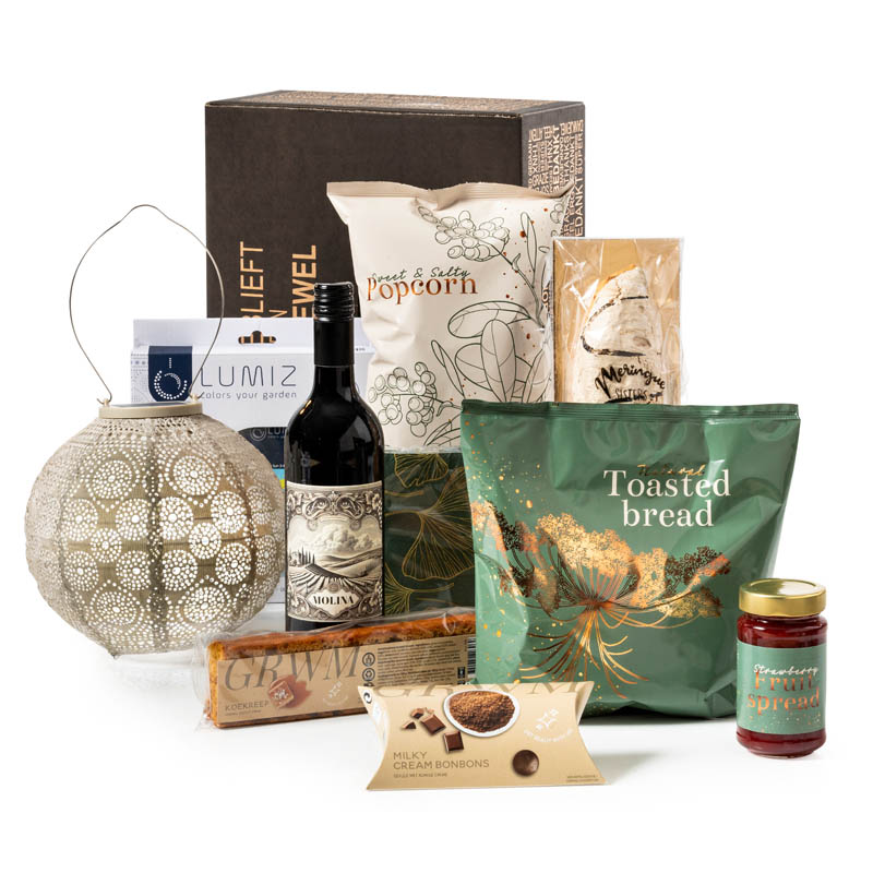 INHOUD: -Originele Lumiz solar lampion lamp in taupe kleur, 20 cm -Servetten, 20 st -Spaanse rode wijn Molina Tempranillo, 75 cl -Popcorn zoet/zout, 90 gram -Geroosterde broodjes, 250 gram -Halvajam aardbei, 250 gram -Milky cream bonbons, 66 gram -Koekreep karamel zeezout, 140 gram -Meringue mokka-hazelnoot scoop, 48 gram -Verpakt in een bijpassende geschenkdoos